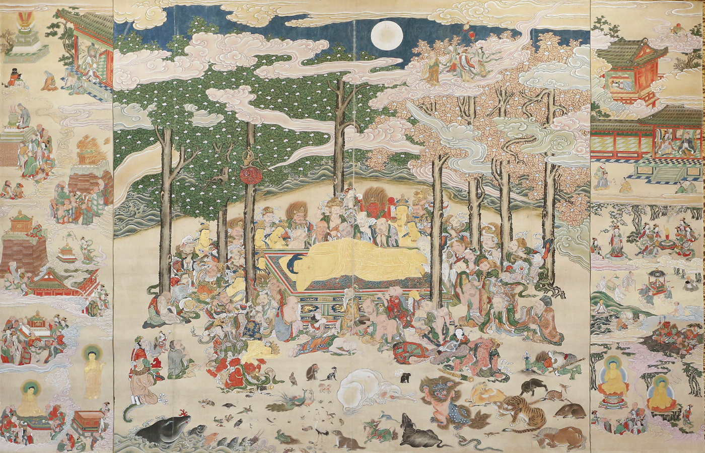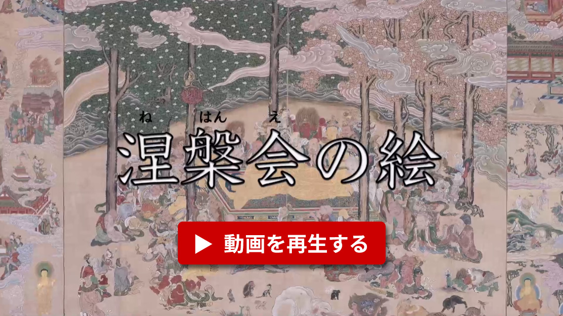 お釈迦様が亡くなるときの情景を描いたのが涅槃図です。この涅槃図は 享保12年(1727)のもので左右にはお釈迦様の前半生と入滅後の出来事が描かれております。また左下に、珊瑚を銜えたクジラやタイ・カツオ・サザエ・アワビ等魚介類が描かれた非常に珍しい作品です。名古屋市博物館、仙台市博物館、国立科学博物館、府中市美術館、米国ロサンゼルス・カウンティ美術館にも貸出展示された貴重な涅槃図です。